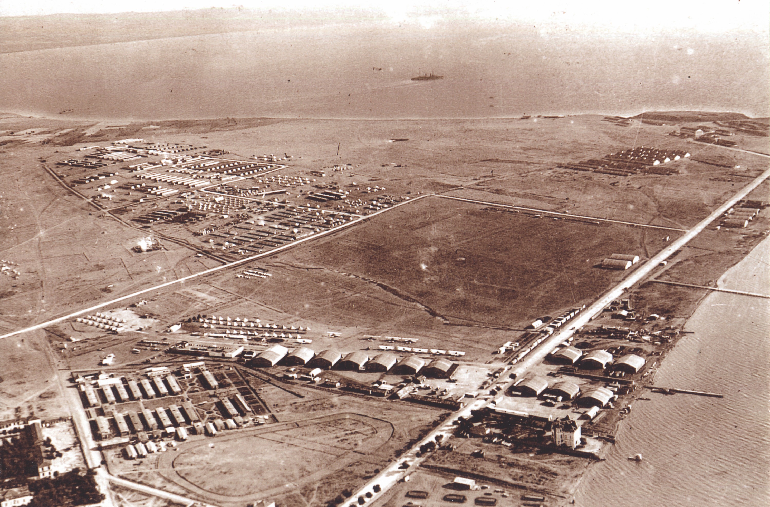 Aerial photography of the First World War. Panoramic view of the area of Kalamaria. In the background on the right is the Kodra Camp, with the barracks built by the Turks. Parallel to the sea on the right is today’s Themistocles Sophouli.To the right of the road ship berths and warehouses. In the foreground is the so-called Aviators’ Villa, and on the left is Villa Allatini, today’s prefecture.