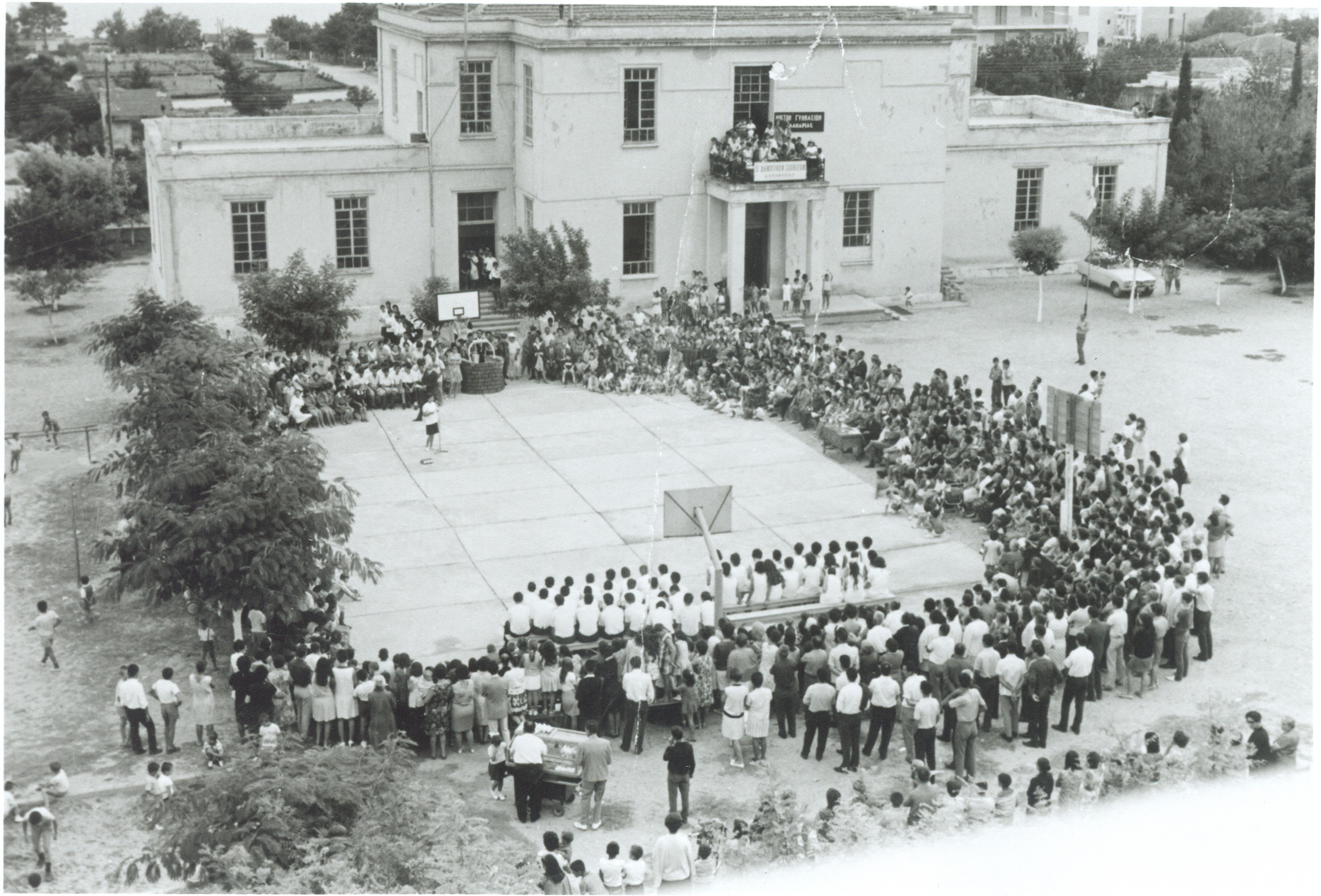 The primary school of Kalamaria. It included the regions of Aretsou, Derkon, N. Krini, Kouri. The school was built around 1929-1931 and is located at the junction of the streets Adramytiou and Taxiarchon. The photograph was taken on the day of the gymnastic performances. Nowadays this place hosts lots of new buildings, namely the kindergarten, the primary school and a hall of multiple uses.